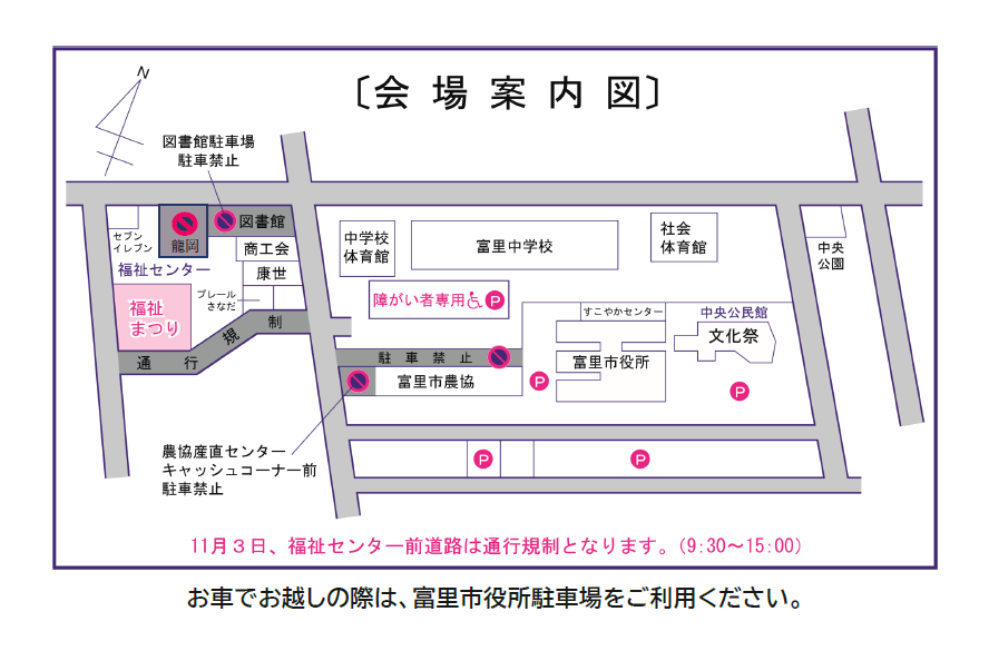 11月3日は富里市福祉センター前面道路が交通規制(9:30~15:00)となります。